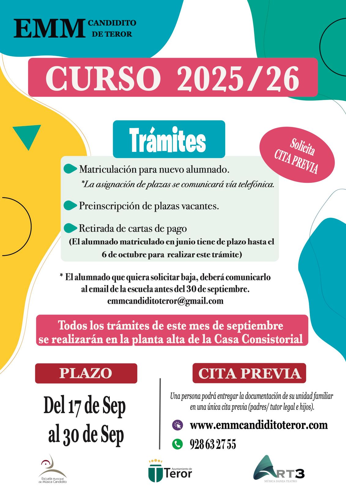 Debido a las obras que se están llevando a cabo en las instalaciones de la Escuela, los trámites administrativos de estos últimos quince días de septiembre se llevarán a cabo en las Casas Consistoriales (antiguo Ayuntamiento de Teror). + información